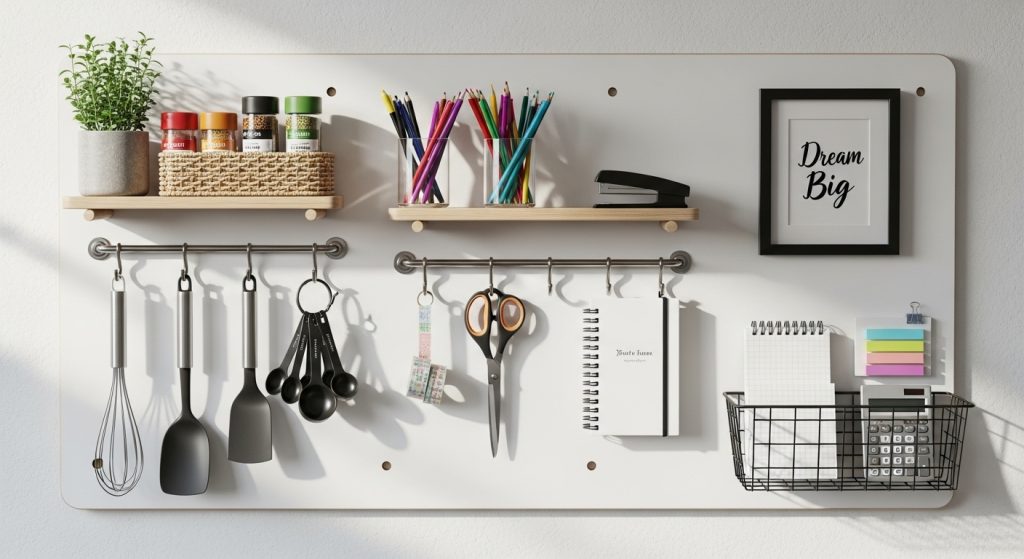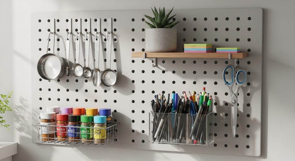 A pegboard organizer is a versatile storage solution for any room. It can hold everything from kitchen tools to office supplies and even accessories in the bedroom. Pegboards help you utilize vertical space while keeping your items within easy reach.
