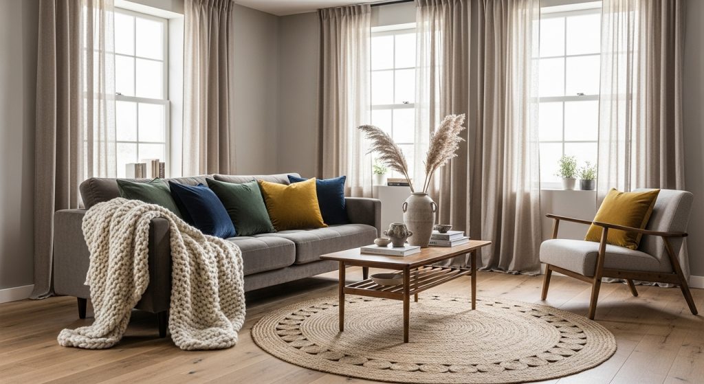 Even a neutral-toned home can feel rich if you add layers of texture. Think velvet cushions, faux fur throws, linen curtains, or jute rugs. The contrast between smooth furniture and cozy fabrics adds depth and keeps the space from feeling flat.