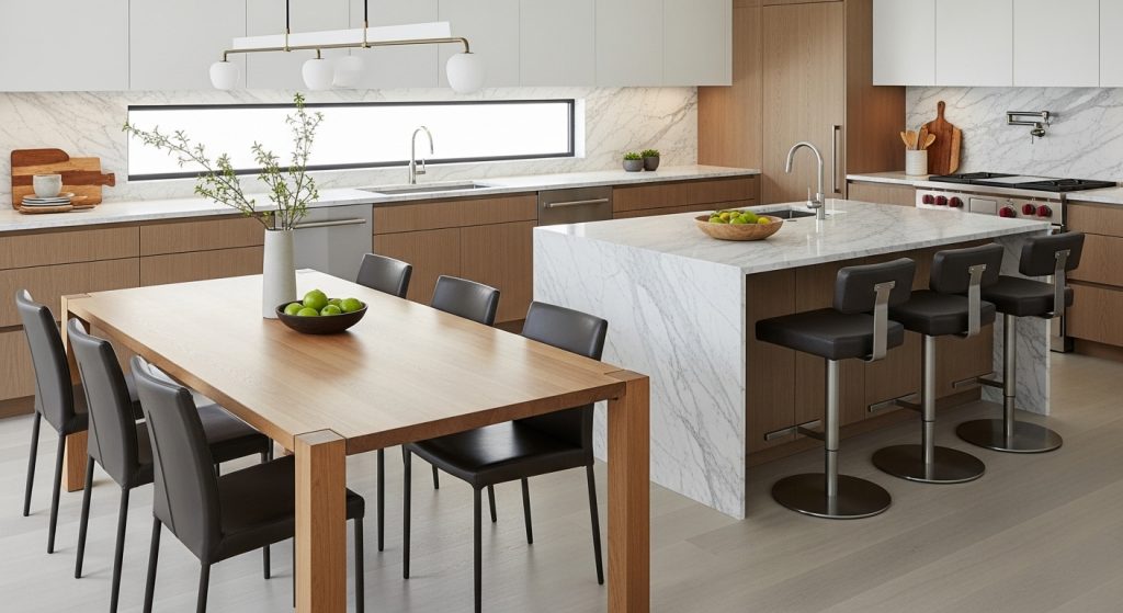 Modern spaces never feel cold because they blend sleek design with organic warmth. Wood, stone, leather, and glass are your best friends. For example, a wooden dining table paired with leather chairs feels polished yet welcoming. Stone countertops in the kitchen or a marble accent table add sophistication that stands the test of time.