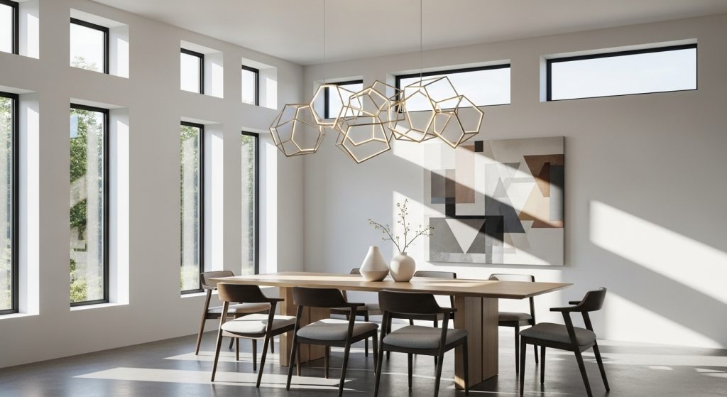Lighting is the secret weapon of modern design. A dramatic pendant light or geometric chandelier doesn’t just brighten your space—it becomes art in itself. Floor lamps with thin frames or wall sconces with unique shapes also add character without overwhelming the space.