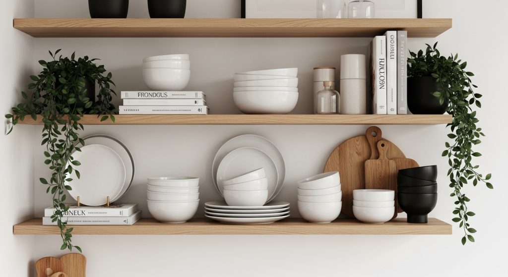 Showcase your prettiest dishes, glassware, or cookbooks on open shelves. Balance function with decor by mixing practical items and styled accessories.