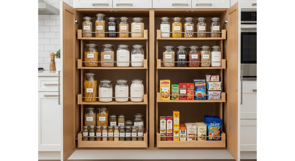 Install pull-out trays in cabinets for easy access to pots, pans, and pantry staples. They reduce clutter and improve visibility.
