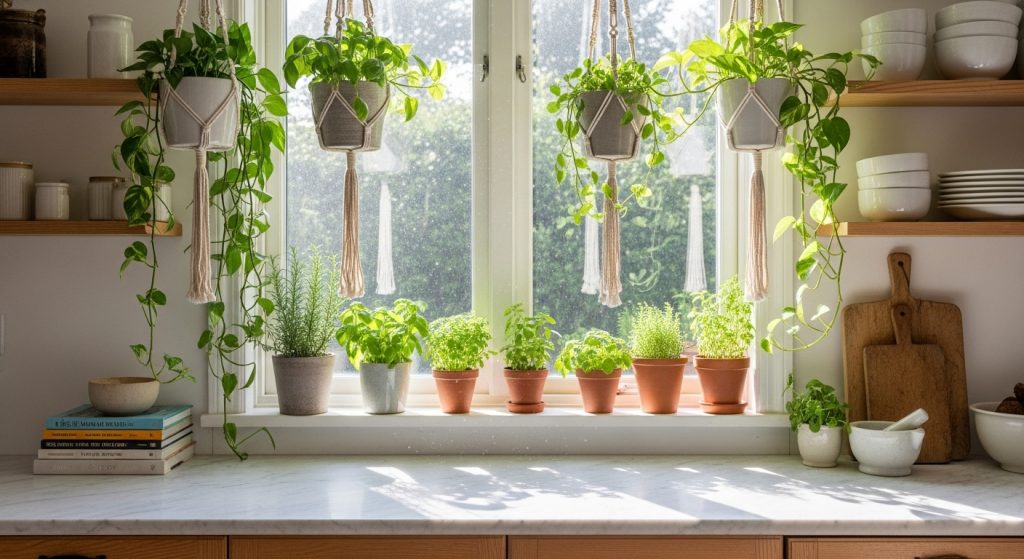 Small potted herbs, hanging plants, or fresh flowers instantly add life and freshness to your kitchen.