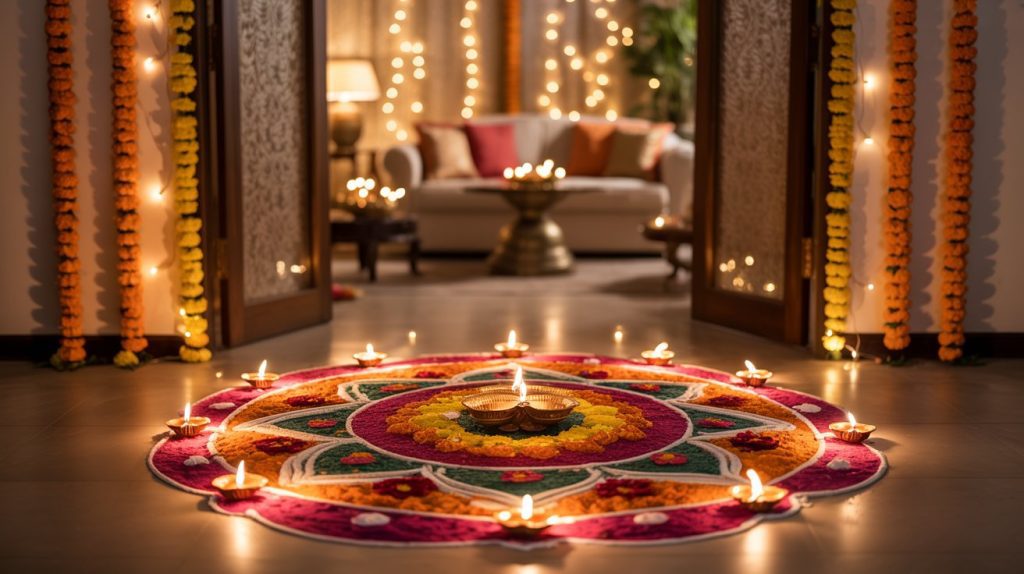 - Rangoli Patterns: Add colorful rangolis with flowers, petals, or powders at the entrance. They symbolize prosperity and beauty.