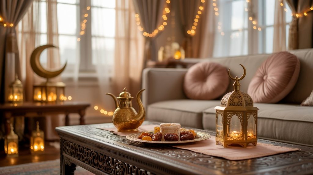 - Dining Table Setup: Style your table with elegant trays, sweets, dates, and tea sets to create a welcoming environment for guests.