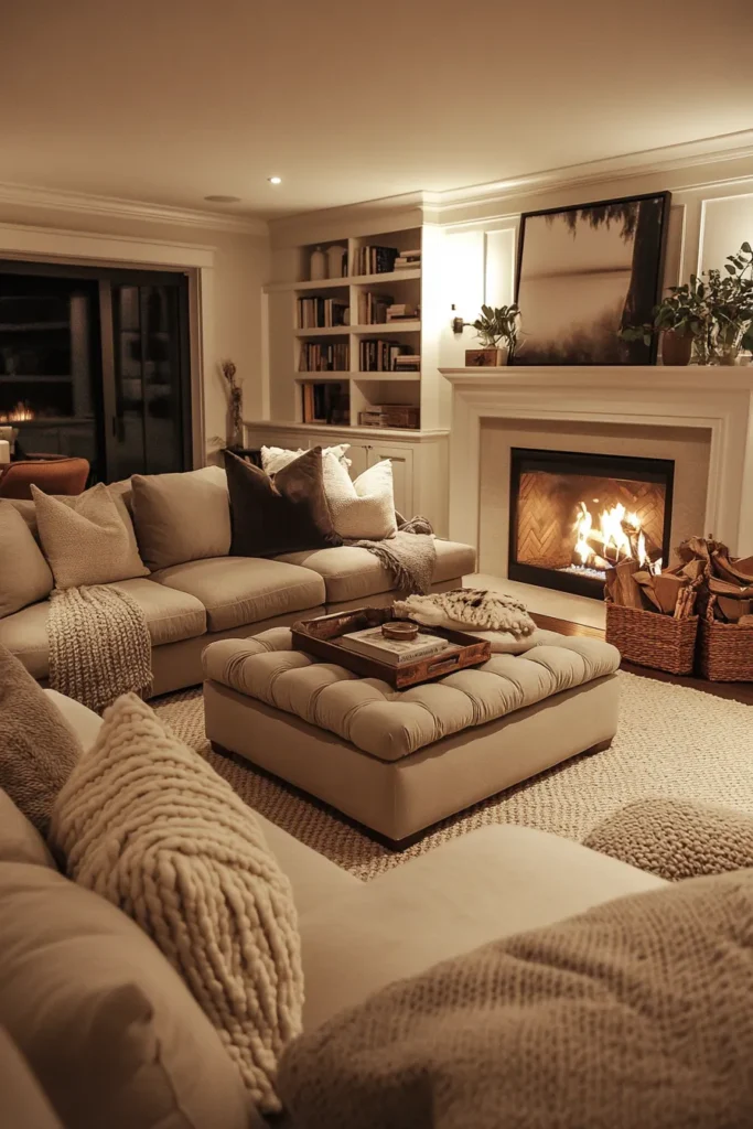 Use soft lighting, cozy textures, and warm fabrics like wool and knit throws.