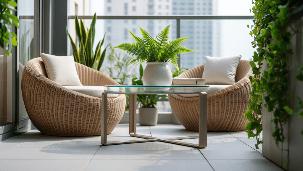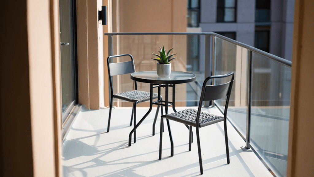 Opt for compact and functional furniture like a bistro table with chairs, foldable furniture, or a slim-profile lounge chair. Multifunctional pieces, such as storage ottomans, work well to save space and maintain an organized look.