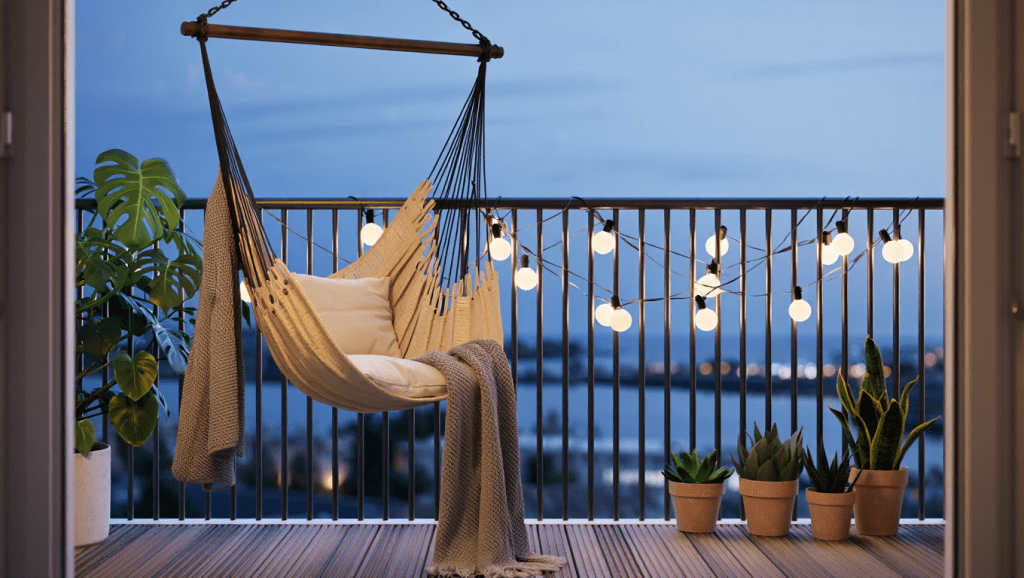 To make a small balcony feel cozy, focus on soft cushions, throws, and comfortable seating like a hammock chair or a small outdoor sofa. Add warm lighting with fairy lights or lanterns, and surround the space with plants for a natural, inviting atmosphere.