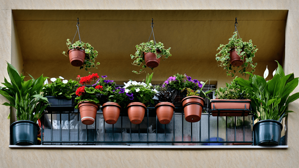 Hanging planters and vertical garden setups are great ways to add greenery to small spaces without taking up floor space. Use potted plants along railings or on shelves, and choose a mix of flowers, herbs, and foliage for variety and texture.