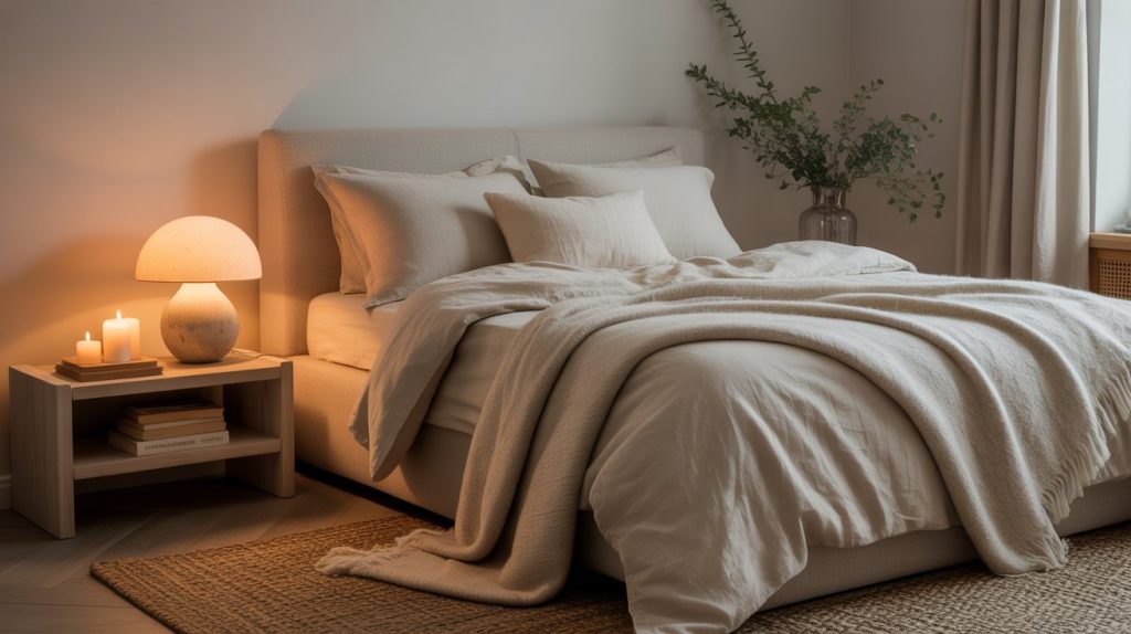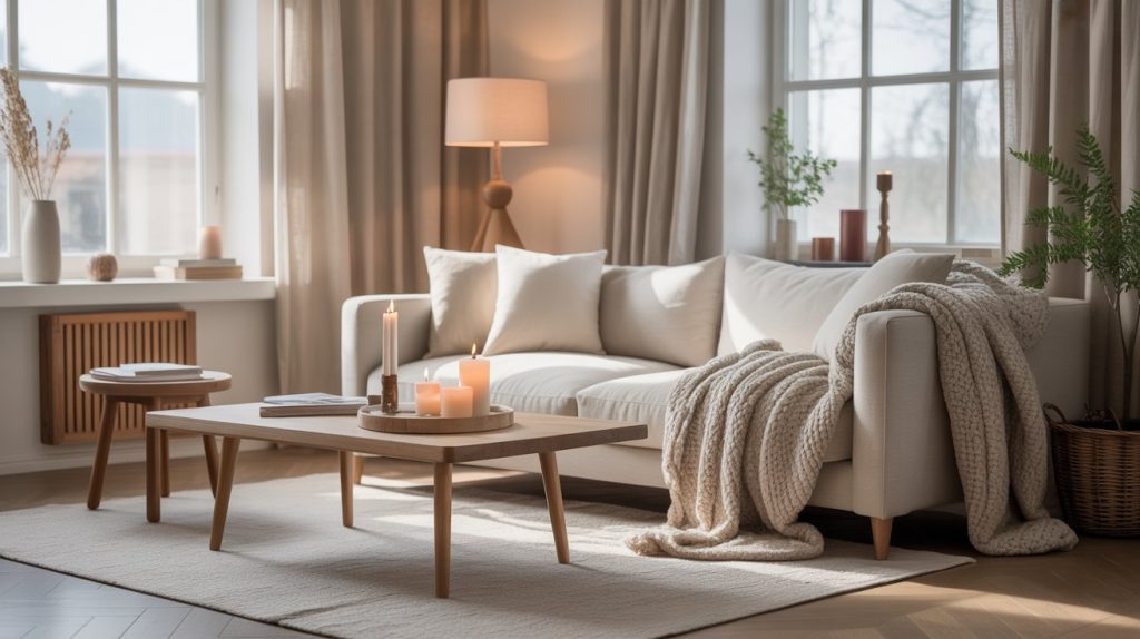 - Warm textures like wool throws, linen curtains, and cotton rugs